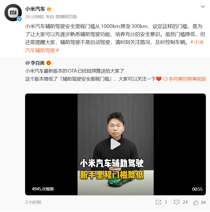 小米汽車近日宣布,其最新版本的OTA更新已開始向用戶推送,此次更新對輔助駕駛功能的安全里程門檻進行了調整。根據官方介紹,用戶激活輔助駕駛功能所需的累計安全駕駛里程,從原先的1000公里降低至300公里。