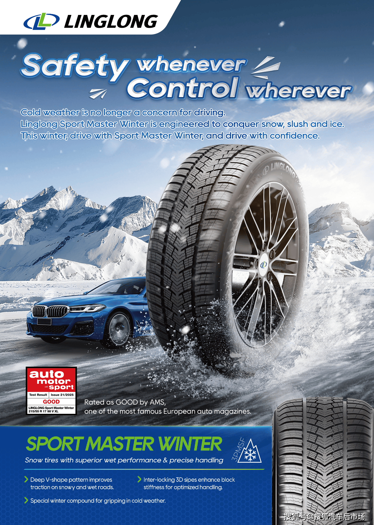 作為玲瓏輪胎歐洲研發團隊主導開發的旗艦產品,Sport Master Winter冬季胎集成了多項國際領先技術。該產品采用全新硅配方與立體刀槽花紋設計,顯著提升冰雪及濕滑路面的摩擦系數;優化后的胎體結構則增強了高速行駛時的抗沖擊能力。與上一代產品相比,其綜合性能提升達15%,在與國際一線品牌的對標測試中,部分指標甚至實現超越,獲得2025年德國《Auto Motor und Sport》雜志"GOOD(很好)"評級認證。