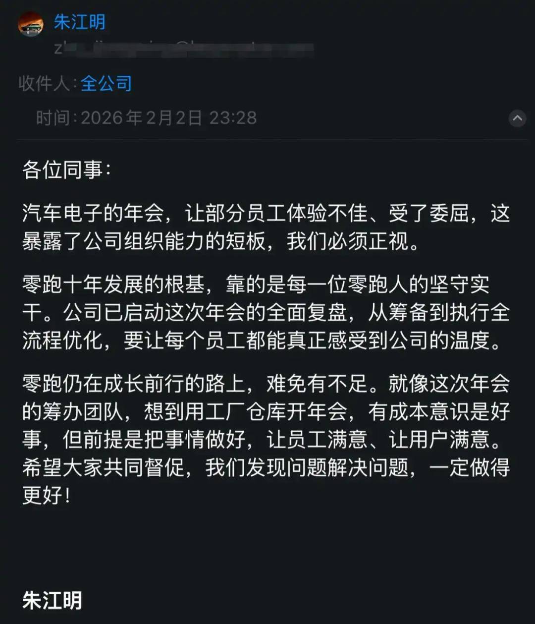 面對(duì)輿論壓力,零跑汽車董事長(zhǎng)朱江明于2月2日深夜發(fā)布內(nèi)部信承認(rèn)失誤。他坦言,選擇工廠倉庫作為年會(huì)場(chǎng)地雖體現(xiàn)成本控制意識(shí),但執(zhí)行過程中未能平衡員工體驗(yàn)與企業(yè)成本,暴露出組織能力短板。公司隨即啟動(dòng)全流程復(fù)盤,承諾優(yōu)化從籌備到執(zhí)行的每個(gè)環(huán)節(jié)。