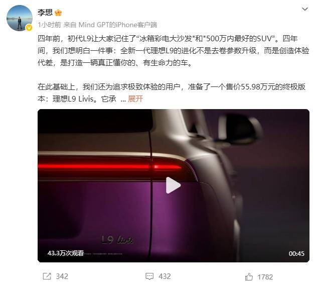 據理想汽車CEO李想透露,全新L9的研發重心從參數堆砌轉向體驗代差。他特別提到,四年前初代車型以“500萬內最好SUV”的標簽打開市場,而新一代產品將通過智能化與機械性能的深度融合,打造“有生命力的座駕”。為滿足高端用戶需求,理想同步推出售價55.98萬元的L9 Livis終極版本,該車型承載了品牌對未來出行的核心思考。