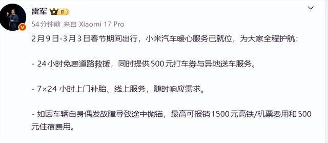 春節(jié)假期臨近,小米汽車宣布推出一系列出行保障服務(wù),為車主返鄉(xiāng)和出游提供便利。2月9日至3月3日期間,小米汽車將上線三項(xiàng)暖心舉措,涵蓋道路救援、上門服務(wù)及費(fèi)用補(bǔ)償?shù)榷鄠€(gè)場(chǎng)景,切實(shí)解決用戶長(zhǎng)途出行中的后顧之憂。