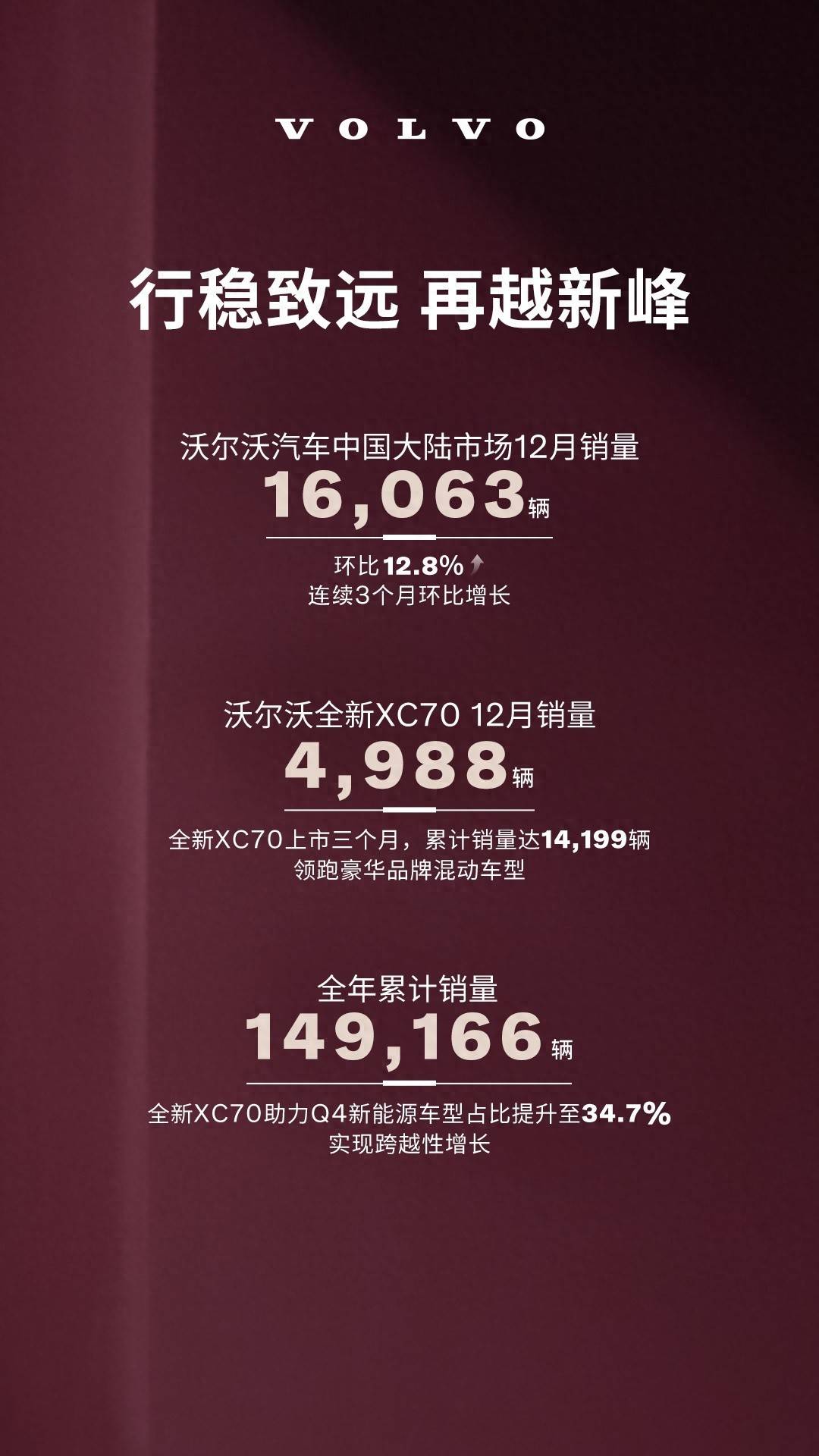 沃爾沃汽車在中國大陸市場交出了一份亮眼的成績單。數據顯示,2025年12月單月銷量達16,063輛,較去年同期增長12.8%,全年累計銷量突破149,166輛。這一成績不僅體現了品牌在豪華車市場的穩健表現,也反映出消費者對沃爾沃產品力的持續認可。