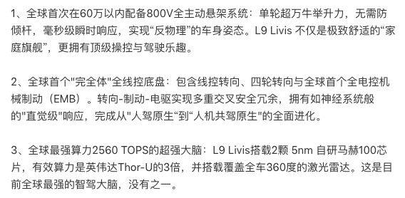 李想在社交媒體上透露,新款理想L9 Livis版本將搭載多項(xiàng)全球領(lǐng)先的技術(shù)配置。他用了兩個(gè)“全球首次”和一個(gè)“全球最強(qiáng)”來形容這款車的配置水平。這些技術(shù)投入能否像以往的“冰箱彩電大沙發(fā)”一樣,轉(zhuǎn)化為消費(fèi)者可感知且獨(dú)特的體驗(yàn),成為市場關(guān)注的焦點(diǎn)。李想表示,理想汽車不會(huì)盲目追求參數(shù)上的優(yōu)勢(shì),而是致力于創(chuàng)造體驗(yàn)上的代差,讓車從被動(dòng)工具變成主動(dòng)伙伴。