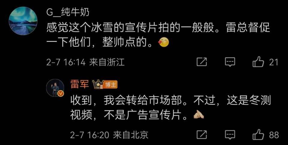 視頻發布后,部分網友對拍攝質量提出改進建議。有用戶留言指出:"畫面清晰度有待提升,建議加強后期制作的專業性。"針對這些反饋,雷軍迅速作出回應,表示已將相關意見轉達市場部門,同時特別說明該視頻為真實測試記錄,并非商業廣告宣傳片。