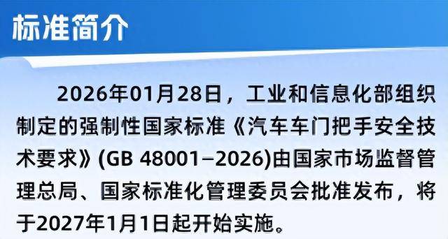 為規(guī)范車門把手設(shè)計(jì),工業(yè)和信息化部于2026年1月28日發(fā)布了強(qiáng)制性國(guó)家標(biāo)準(zhǔn)《汽車車門把手安全技術(shù)要求》(GB 48001-2026)。該標(biāo)準(zhǔn)明確要求,每個(gè)車門(不含背門)必須配備機(jī)械釋放車門外把手,確保在安全氣囊展開或動(dòng)力電池?zé)釘U(kuò)散等緊急情況下,乘客仍能通過(guò)機(jī)械方式開啟車門。同時(shí),車內(nèi)也需配備至少一個(gè)獨(dú)立操作的機(jī)械釋放內(nèi)把手,且安裝位置需直觀可見、無(wú)遮擋。
