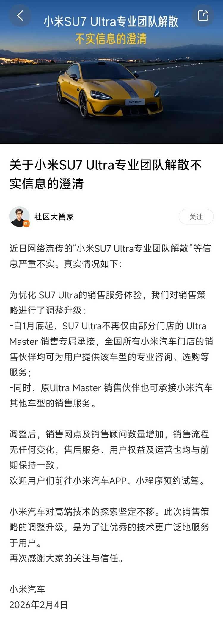 小米汽車辟謠SU7 Ultra團隊解散:銷售策略調整升級,服務體驗更優化