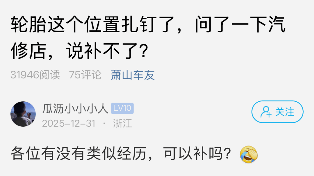 近日,一位蕭山車主在蕭內網App上發(fā)帖求助,稱自己的輪胎在胎冠與胎肩交界處扎入一顆螺絲釘,詢問多家汽修店后均被告知無法修補,引發(fā)網友熱議。這一常見但位置特殊的輪胎損傷問題,讓不少車主陷入“補胎還是換胎”的糾結。