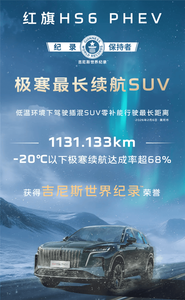 一汽紅旗旗下全新大五座旗艦SUV紅旗HS6 PHEV,近日在黑龍江省黑河市完成了一項(xiàng)極具挑戰(zhàn)性的測試——以原廠素車狀態(tài)在-20℃至-30℃的極寒環(huán)境中,實(shí)現(xiàn)滿油滿電零補(bǔ)能續(xù)航1131.133公里,成功刷新低溫環(huán)境下插混SUV續(xù)航紀(jì)錄。