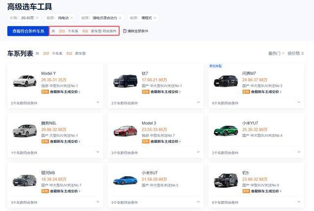 在新能源汽車市場的版圖中,20萬至30萬價位區間正成為車企競相角逐的“兵家必爭之地”。這一價格帶不僅匯聚了大量消費者關注,更成為車企展示技術實力與品牌競爭力的核心戰場。據統計,當以新能源為篩選條件搜索該價位車型時,結果令人咋舌——共出現253個車系、932款車型,其中不乏比亞迪、小米、問界、特斯拉等頭部品牌的明星產品。