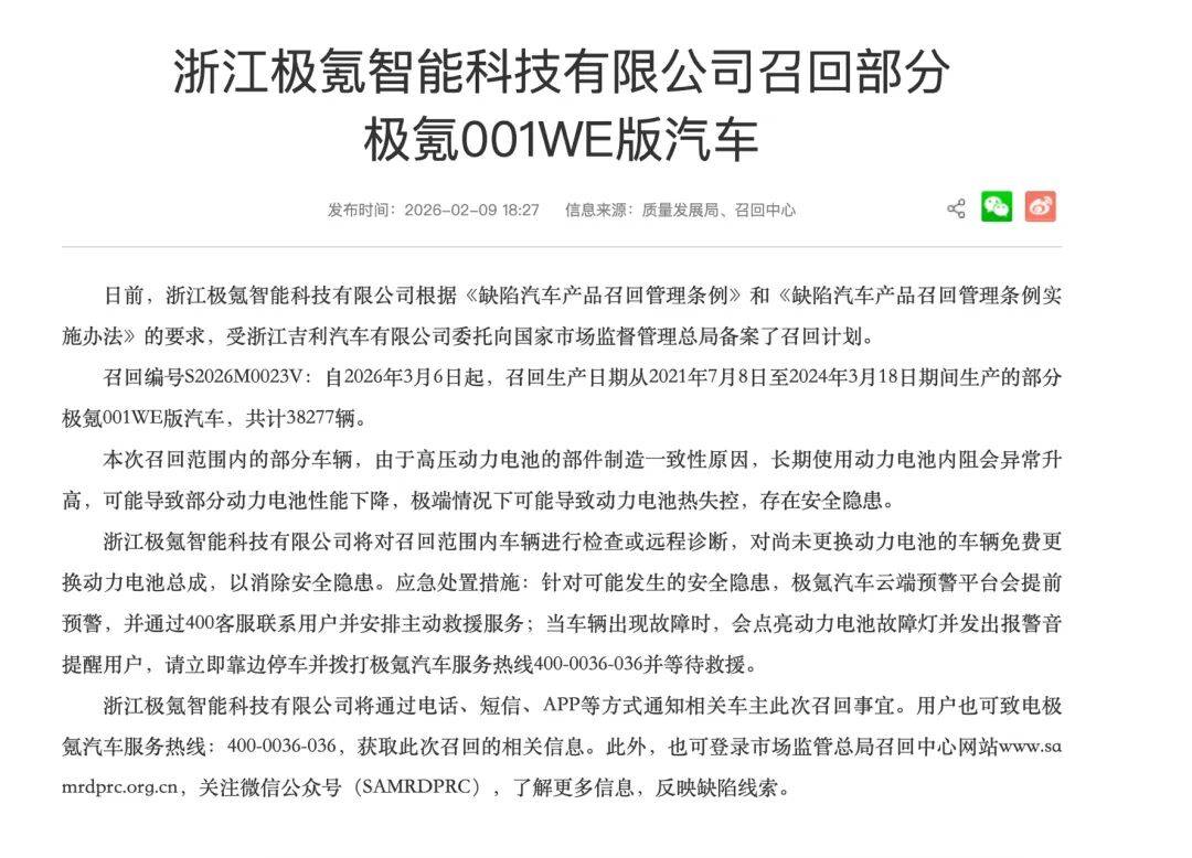 召回行動源于極氪云端監測系統對動力電池的提前風險預警。經檢測發現,部分車輛因電池內部部件制造工藝存在一致性偏差,長期使用后可能出現內阻異常升高、性能衰減等問題。為消除安全隱患,企業將為召回車輛免費更換全新電池,并完整保留原有三電系統終身質保權益。
