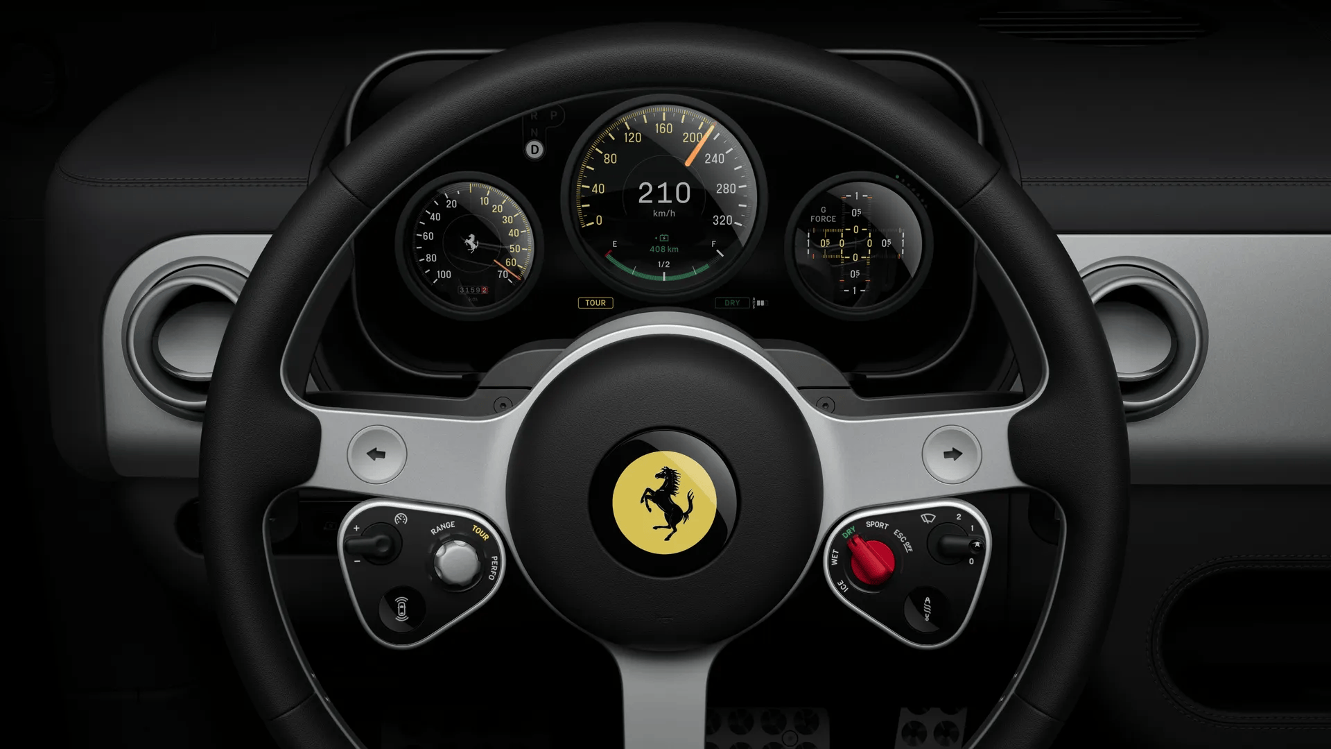 人機交互界面以“觸感、清晰、直覺”為核心設計理念。方向盤采用簡化三幅結構,靈感源自20世紀50-60年代的木質Nardi方向盤,整體分為兩個類似F1賽車的控制模塊,重量較標準法拉利方向盤減輕400克。中控臺搭載行業首發的彩色E-Ink墨水屏鑰匙,插入后屏幕顏色由黃轉黑,同步點亮儀表盤與中控屏,營造沉浸式駕駛氛圍。實體按鍵的保留進一步強化了人車互動的直接性。