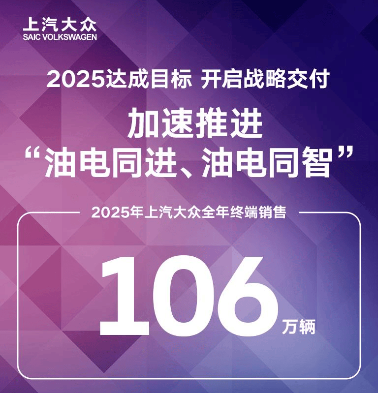 在汽車行業電動化轉型的浪潮中,上汽大眾以穩健的步伐交出了一份亮眼答卷。面對新能源滲透率突破50%、燃油車市場持續收縮的挑戰,這家合資車企通過“油電同進、油電同智”戰略,不僅穩住了年銷百萬輛的基盤,更在新能源賽道上構建起差異化競爭力。數據顯示,2025年上汽大眾終端銷量達106萬輛,其中大眾品牌零售銷量突破百萬輛,連續多年蟬聯合資品牌單一品牌銷量冠軍,成為傳統車企轉型的標桿案例。