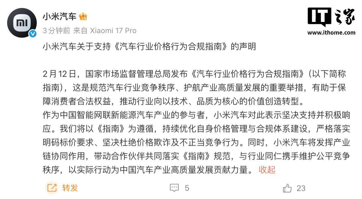 小米汽車積極響應(yīng)《汽車行業(yè)價(jià)格行為合規(guī)指南》 助力行業(yè)公平競(jìng)爭(zhēng)與高質(zhì)量發(fā)展