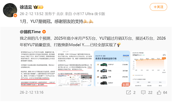 回顧2025年第四季度表現(xiàn),YU7在10月、11月分別取得33662輛和33729輛的銷量,顯示出穩(wěn)定的產(chǎn)能釋放能力。12月銷量突破3.9萬輛的峰值,既驗證了市場需求的旺盛,也為新年首月登頂?shù)於ɑA(chǔ)。這種持續(xù)攀升的軌跡,與部分新勢力品牌常見的"高開低走"模式形成鮮明對比。