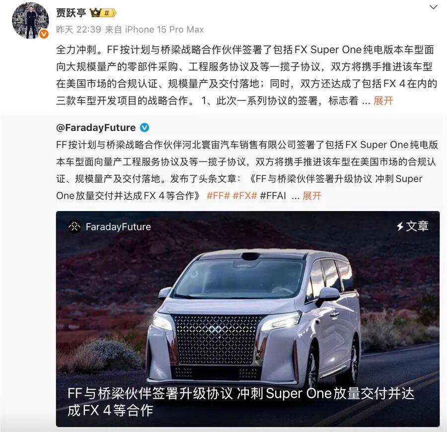 賈躍亭在社交媒體透露,此次合作標志著FF"橋梁戰略"進入新階段,雙方將全力確保2026年第二季度實現Super One規模化交付。這個時間節點對FF至關重要——作為造車新勢力元老級品牌,FF91從2017年首發到2023年首臺交付耗時六年,期間多次陷入資金鏈危機。當前資本市場對FF的耐心已接近臨界點,Super One的量產進度直接關系到品牌存續。