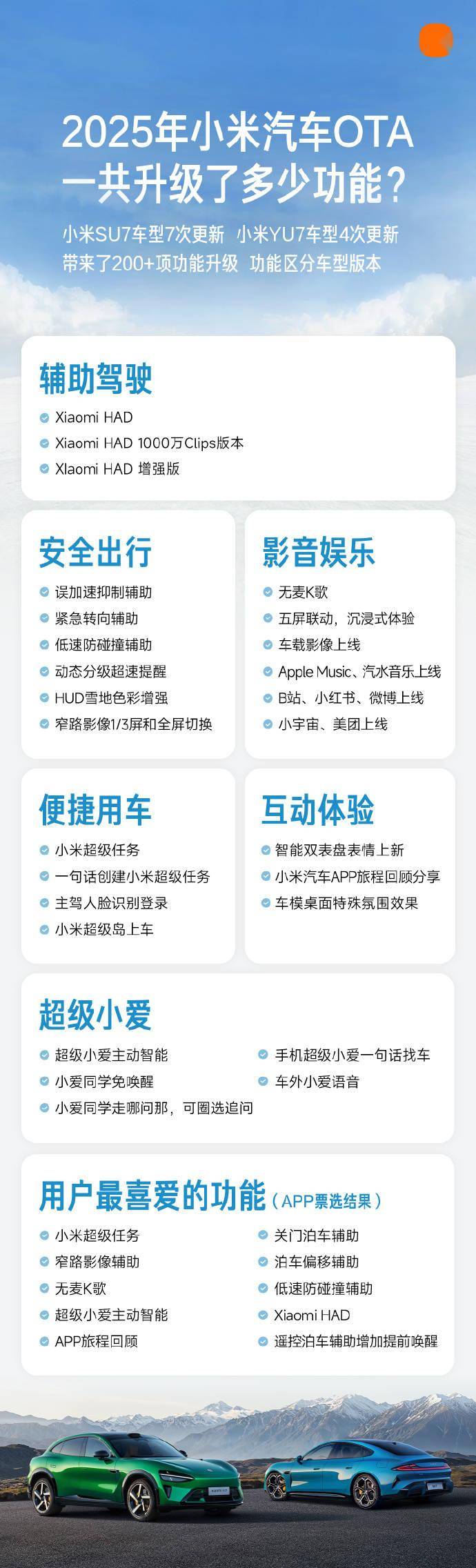 小米汽車近日對外披露了其車型功能更新的詳細數據。2025年,小米SU7車型累計完成7次系統更新,小米YU7車型則進行了4次迭代,兩大車型合計新增超過200項功能,覆蓋輔助駕駛、安全出行、智能交互等多個領域。
