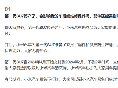 針對(duì)第一代SU7車主的售后保障,小米汽車承諾將繼續(xù)提供完整的維修及保養(yǎng)服務(wù),并儲(chǔ)備充足零部件,確保至少10年的備件供應(yīng)能力。目前,新一代SU7的卡布里藍(lán)實(shí)車已在北京超級(jí)工廠店展出,并自2月13日起陸續(xù)登陸上海、杭州、廣州等七座城市的部分門店。