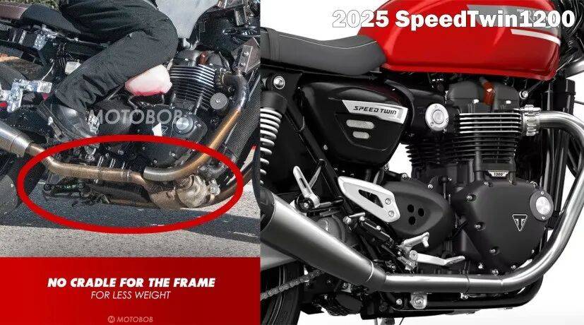 海外媒體近日捕捉到凱旋SpeedTwin1200全新測試車的身影,從路試畫面來看,這絕非簡單的外觀微調(diào),而是基于全新底盤打造的新一代車型。由于車身尚未覆蓋完整外觀件,推測其仍處于前期開發(fā)階段。車架部分的變化尤為顯著,標(biāo)志性的雙搖籃鋼管車架被棄用,轉(zhuǎn)而采用以發(fā)動(dòng)機(jī)作為受力結(jié)構(gòu)的現(xiàn)代設(shè)計(jì)。這種調(diào)整不僅有望大幅減輕車重——現(xiàn)款整備質(zhì)量為216kg,還能使彎道中的車身反饋更加直接,顯著提升操控性能,整體設(shè)計(jì)思路完全偏向運(yùn)動(dòng)化。