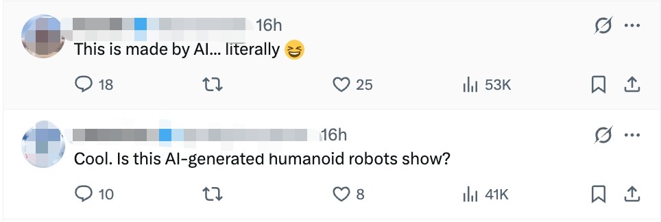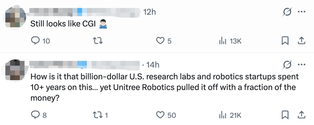 推文的評(píng)論區(qū)充斥著驚嘆與難以置信:“這是AI生成的嗎?”“這些是不是人假扮的?”“為什么美國(guó)那些耗資數(shù)十億美元的研究實(shí)驗(yàn)室花了十多年時(shí)間才做到的事,宇樹只用了其中一小部分資金就做到了?”