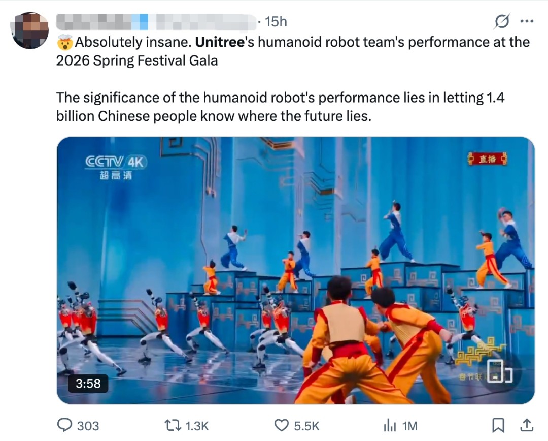 這場(chǎng)名為《武BOT》的機(jī)器人武術(shù)大秀,迅速從國(guó)內(nèi)火到海外。在社交媒體X上,一條條視頻切片動(dòng)輒贏得上百萬(wàn)預(yù)覽量、數(shù)千次點(diǎn)贊轉(zhuǎn)發(fā)以及數(shù)百條評(píng)論。這些博主贊嘆“短短一年內(nèi),他們就從機(jī)器人進(jìn)化成了‘人類’”,“簡(jiǎn)直太瘋狂了……其意義在于讓14億中國(guó)人了解未來在哪里”。