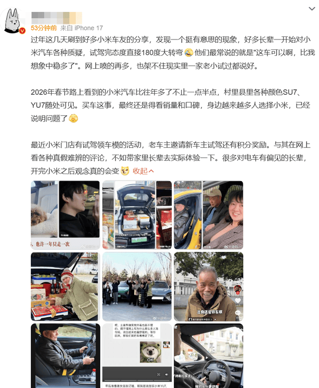 一位博主提到,過去長輩選車時更看重品牌標志,但如今卻主動排隊試駕小米汽車。他感慨:“認可度是靠實際體驗積累的,流言蜚語再多,也抵不過一次親身體驗。”另一位博主則分享了父親和表哥試駕YU7后的反應(yīng):他們對車輛的轉(zhuǎn)向精準度、操控性能和底盤調(diào)校贊不絕口,甚至有親戚對車內(nèi)空間、舒適性和靜謐性表示“刷新認知”。