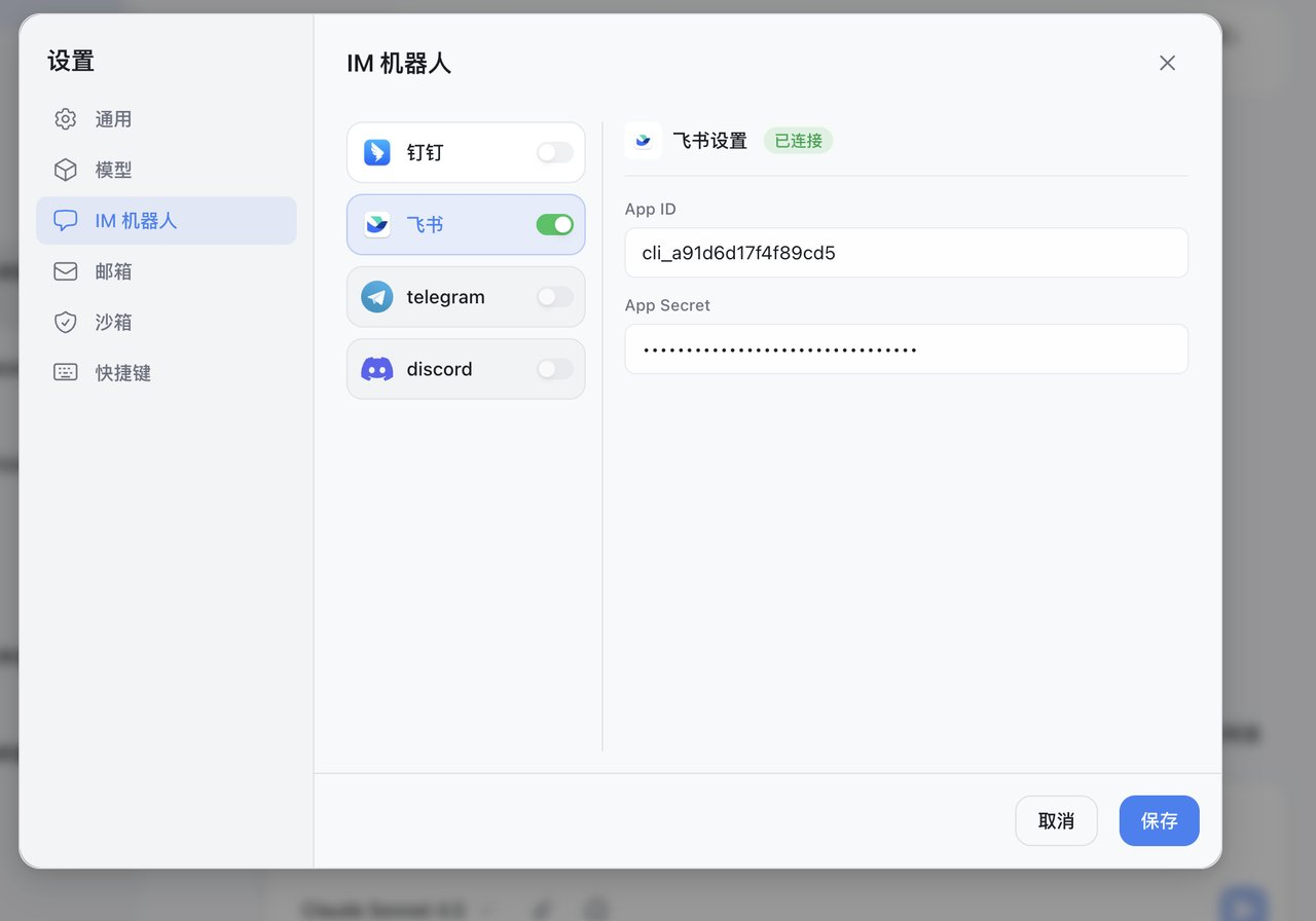 接下來,我們要把飛書后臺(tái)和本地的 LobsterAI 客戶端綁定。先在飛書后臺(tái)的「憑證與基礎(chǔ)信息」中,復(fù)制 App ID 和 App Secret。然后打開電腦上的 LobsterAI,進(jìn)入「設(shè)置」->「IM機(jī)器人」->「飛書」標(biāo)簽頁,把這兩串秘鑰粘貼進(jìn)去并點(diǎn)擊保存。當(dāng)你看到上方亮起綠色的已連接字樣時(shí),握手完成。