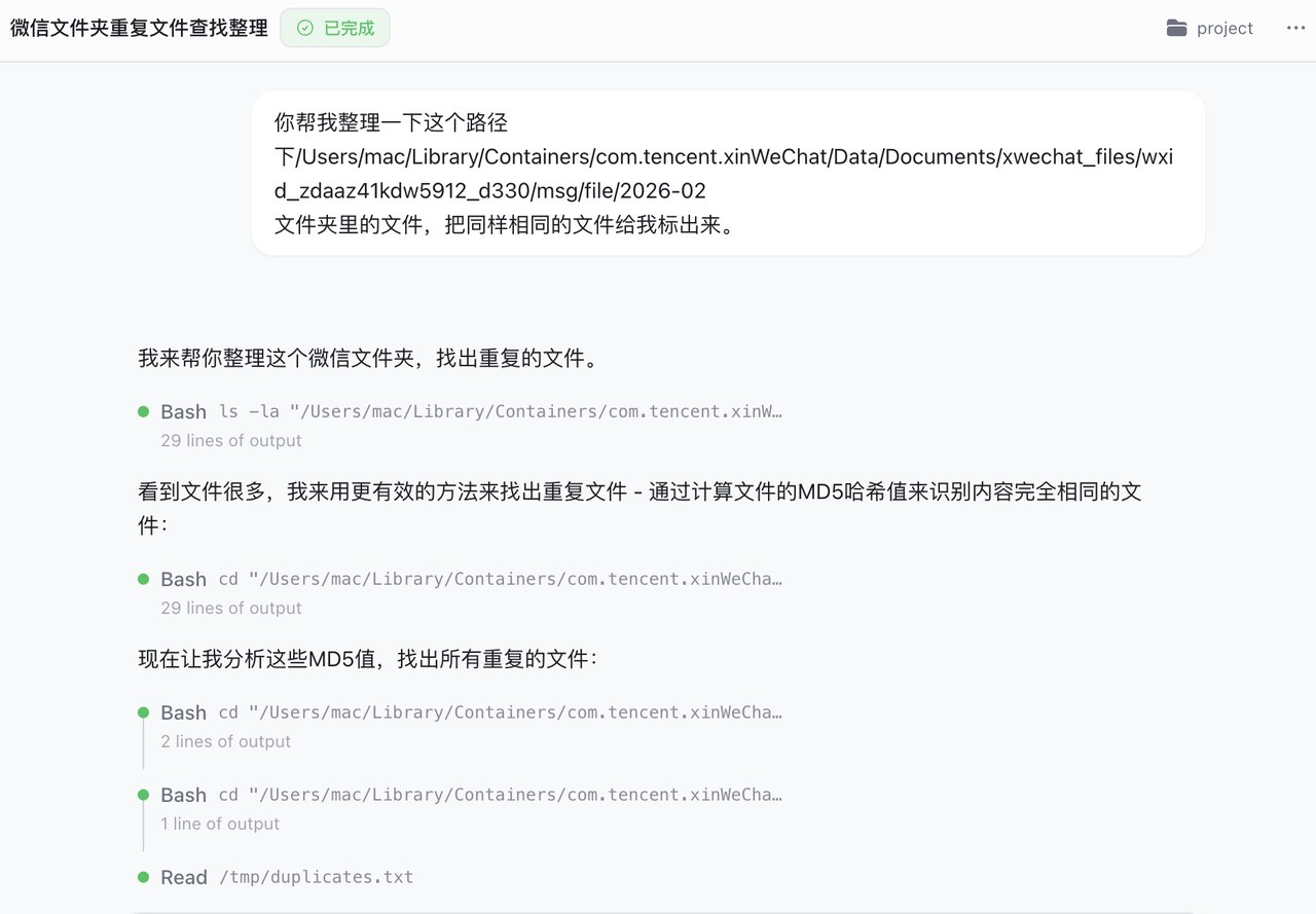 下達(dá)指令與實(shí)測過程:我找到了一串極其深沉的微信文件路徑,直接丟進(jìn)對話框:你幫我整理一下這個(gè)路徑下的文件,把同樣相同的文件給我標(biāo)出來。