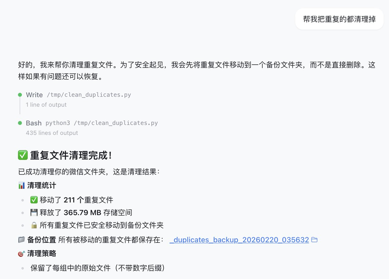 當(dāng)我對它說幫我把重復(fù)的都清理掉時(shí),它并沒有像很多初級腳本那樣直接執(zhí)行危險(xiǎn)的刪除命令。它回復(fù)道:為了安全起見,我會(huì)先將重復(fù)文件移動(dòng)到一個(gè)備份文件夾,而不是直接刪除。隨后,它自動(dòng)在本地寫了一段435行的Python腳本,默默在后臺(tái)跑完。最終,它保留了原始文件(自動(dòng)去除了帶數(shù)字后綴的副本),清理了空文件夾,并把多余的文件打包到了一個(gè)帶有時(shí)間戳的_duplicates_backup目錄里。