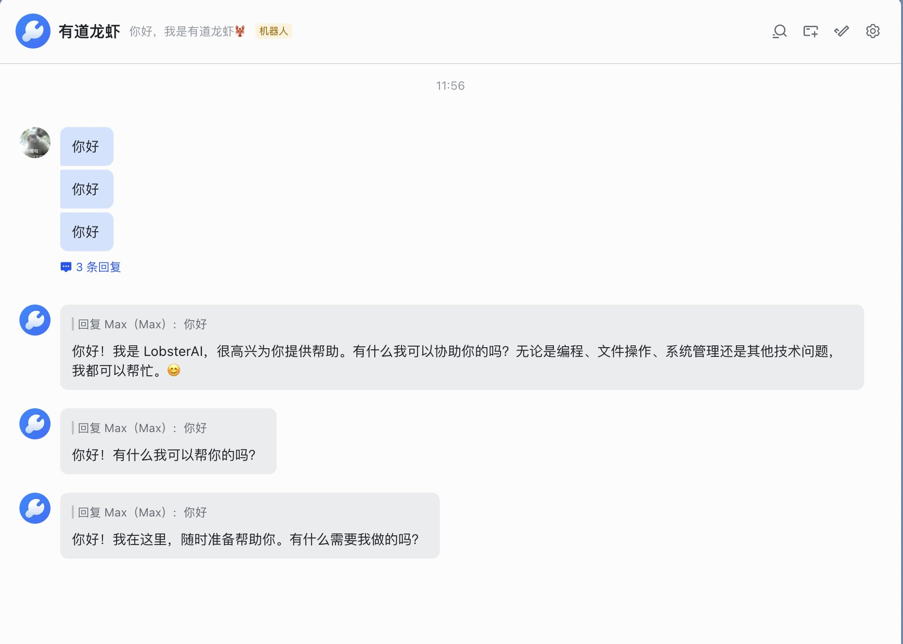 我在手機(jī)飛書上搜到了這只有道龍蝦,隨便發(fā)了幾句你好測試它有沒有鏈接成功。