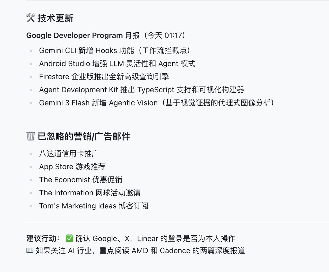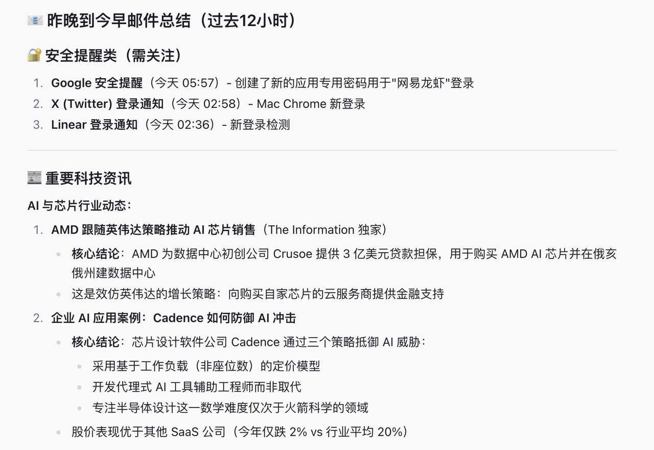 幾分鐘后,它給我交付了一份令人極度舒適的《昨晚到今早郵件總結(jié)》。這份報(bào)告完全不是簡單的關(guān)鍵詞堆砌,而是展現(xiàn)出了極強(qiáng)的閱讀理解能力:它把系統(tǒng)安全提醒(Google、Twitter、Linear的異地登錄通知)放在了最前面,提醒我優(yōu)先關(guān)注。