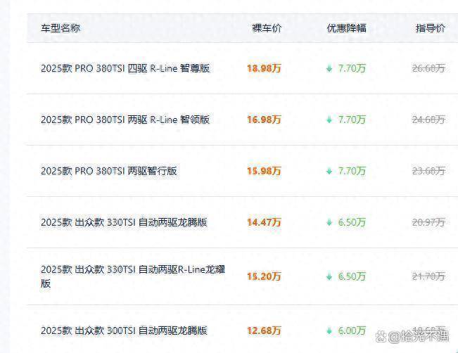 以2026款途觀L Pro 380TSI兩驅智行版為例,其官方指導價雖仍標注為23.68萬元,但終端綜合優惠已逼近10.7萬元,裸車價直接跌破13萬元。即便算上購置稅、交強險和商業險,全套落地費用也僅在14.5萬至14.8萬元之間,精準卡位15萬元價格紅線。這一價格策略,讓三年前僅能購買緊湊型合資SUV的預算,如今足以將中型尺寸、2.0T動力和德系底盤的途觀L開回家,甚至有老車主感嘆:“晚買幾年,省下的錢夠再買一輛代步車。”