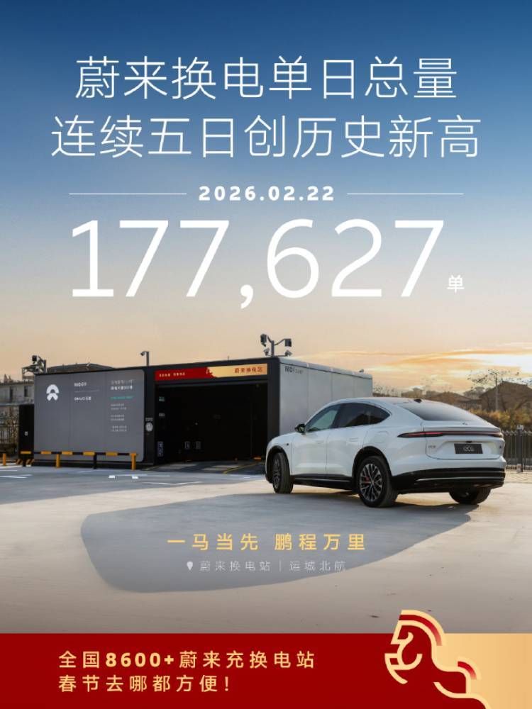 蔚來換電服務在春節返程高峰期間迎來歷史性突破。2月22日(大年初六),蔚來單日換電總量達177,627次,平均每0.5秒即完成一次換電操作,創下品牌運營以來的最高紀錄。當日,高速公路服務區換電站表現尤為突出,單日換電單量前三的站點均位于高速路段,其中最高單站換電量達191次,有效緩解了返程車流的充電壓力。