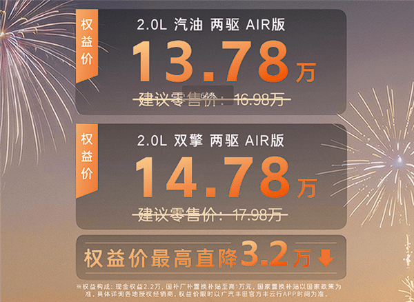廣汽豐田全新威蘭達(dá)AIR版今日正式登陸市場(chǎng),作為新一代車型的入門版本,其官方指導(dǎo)價(jià)區(qū)間為13.78-14.78萬(wàn)元,較此前16.98萬(wàn)元的起售價(jià)直降3.2萬(wàn)元。這一價(jià)格調(diào)整得益于現(xiàn)金優(yōu)惠、國(guó)家補(bǔ)貼及廠家補(bǔ)貼的疊加效應(yīng),創(chuàng)下該車系價(jià)格新低。新車同步推出限時(shí)購(gòu)車權(quán)益,包括2099元享4次原廠保養(yǎng)的直銷套餐,以及首付1.46萬(wàn)元、月供1650元的8年超長(zhǎng)期低息金融方案。