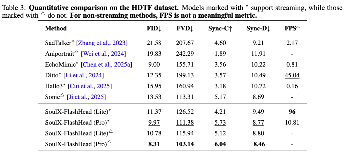 在 HDTF 與 VFHQ 兩大權威數據集的實測中,SoulX-FlashHead 展現了出色的表現: