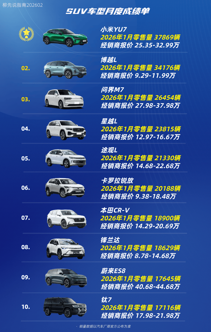 銷量前五的SUV車型分別是小米YU7、博越L、問界M7、星越L和途觀L。1月,這三款車型的銷量分別達到37869輛、34176輛和26454輛,形成新的第一梯隊。市場觀察顯示,中大型SUV的興起反映了消費升級趨勢,消費者不僅需要車輛滿足基本出行需求,還追求更大的空間、更豪華的配置和更強的動力性能,這類車型常用于家庭出行和商務接待。
