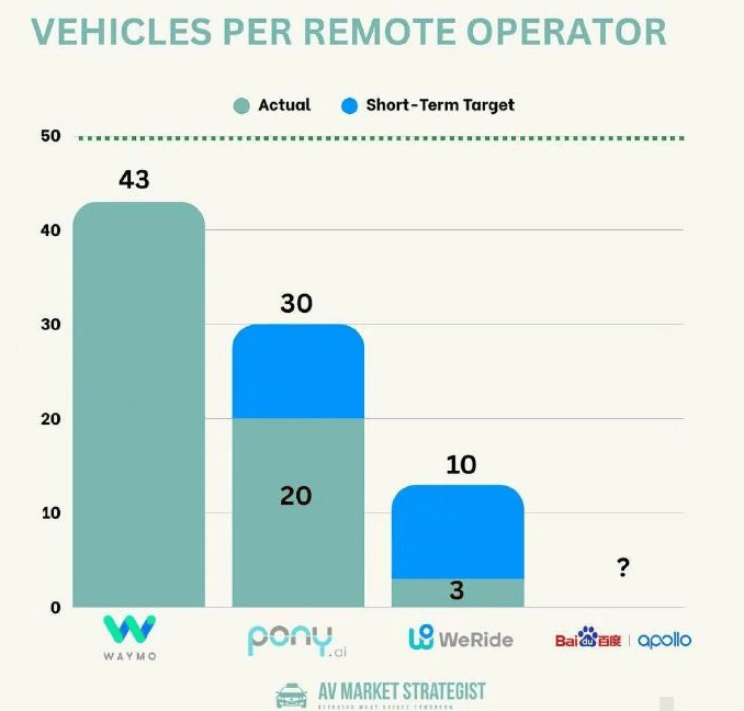報告首次披露四大自動駕駛企業的"人機比"數據:Waymo以1:43的配比領先全球,即每43輛車僅需1名遠程操作員;小馬智行當前比例為1:20,計劃年內提升至1:30;文遠知行目前為1:3,短期目標為1:10;百度Apollo則未公開具體數值。這些數據折射出各企業在技術成熟度與商業化進程上的差異,其中Waymo的運營效率尤為突出。