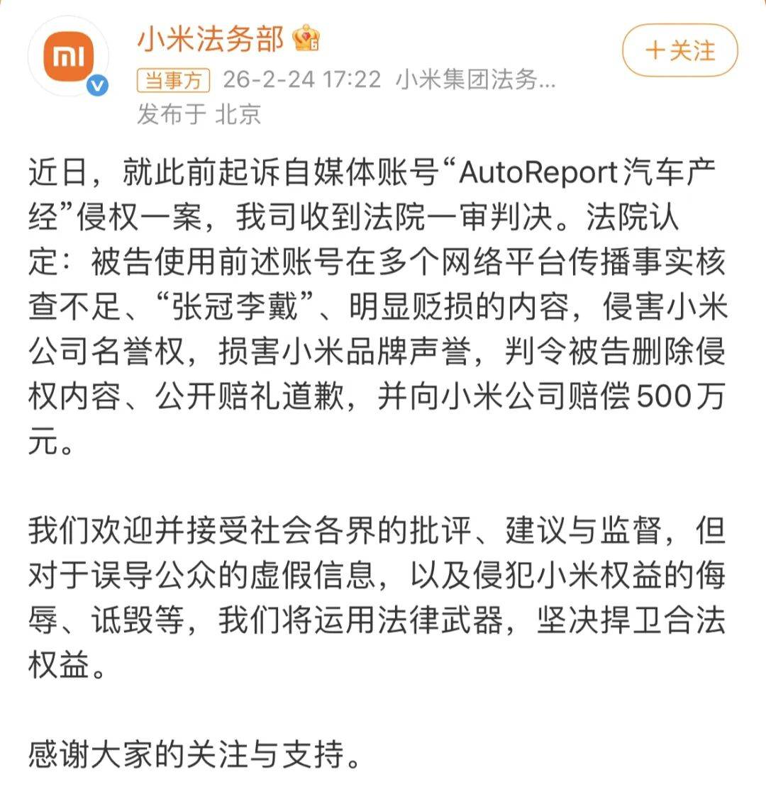 最新司法進展顯示,小米法務部針對自媒體賬號"AutoReport汽車產經"的侵權訴訟取得突破性進展。法院一審判決認定,該賬號在多個平臺發布的涉小米內容存在事實核查缺失、信息張冠李戴、主觀貶損等情形,構成對小米公司名譽權的侵害。判決要求被告刪除全部侵權內容,在指定平臺公開道歉,并賠償小米經濟損失500萬元。