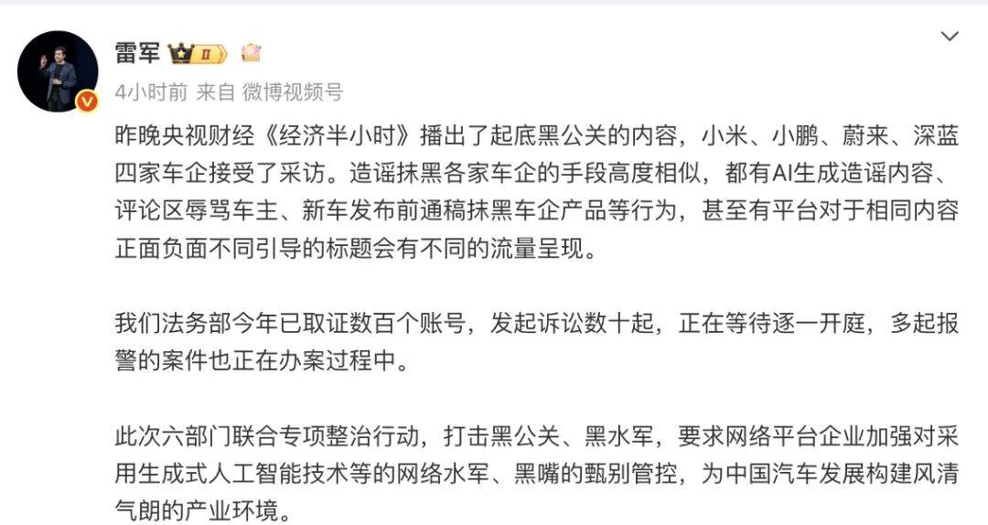 小米集團創始人雷軍曾多次公開表態,自小米汽車發布以來,企業遭遇大量不實信息攻擊,成為網絡黑公關的重點目標。他明確支持六部委開展的專項整治行動,并透露小米法務部已對數百個賬號完成取證,正式發起數十起訴訟程序。這一表態與比亞迪的維權路徑形成呼應,顯示出頭部車企對凈化行業生態的共同訴求。