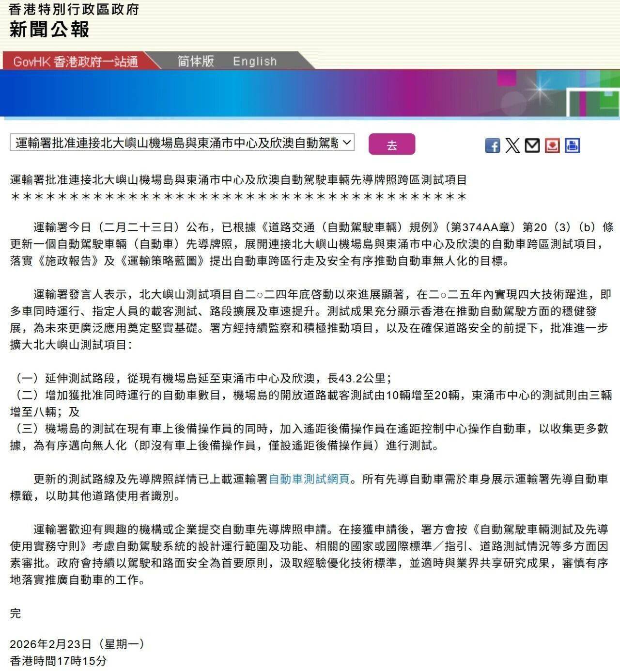 業(yè)內(nèi)人士指出,此次跨區(qū)測試路線的貫通具有雙重戰(zhàn)略意義:一方面,通過連接機(jī)場與核心居住區(qū),構(gòu)建起覆蓋"最后一公里"的測試場景;另一方面,夜間及偏遠(yuǎn)區(qū)域的測試數(shù)據(jù)積累,將為自動(dòng)駕駛技術(shù)填補(bǔ)公共交通覆蓋盲區(qū)提供關(guān)鍵支撐。運(yùn)輸署相關(guān)負(fù)責(zé)人表示,該測試項(xiàng)目是落實(shí)《運(yùn)輸策略藍(lán)圖》及《施政報(bào)告》中智能交通發(fā)展目標(biāo)的重要實(shí)踐,后續(xù)將根據(jù)測試結(jié)果逐步優(yōu)化監(jiān)管框架,推動(dòng)自動(dòng)駕駛技術(shù)安全有序落地。