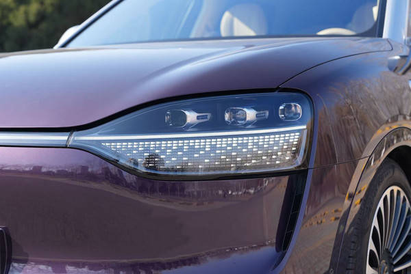 這款車身長達5230mm、軸距3110mm的龐然大物,卻以顛覆性的設計語言打破傳統豪華車的固有印象。貫穿式日行燈與智能矩陣大燈的融合設計,配合"銀鏡紫"專屬車漆,在陽光下呈現出深邃的紫色光澤與銀色金屬質感交織的視覺效果。這種獨特的配色方案既避免了紫色的輕浮感,又通過銀色元素的調和展現出沉穩大氣的氣質。尾部智能交互矩陣燈組更成為設計亮點,其提供的"燈籠""城市風光"等創意燈語,讓車輛在夜間行駛時成為流動的藝術品。