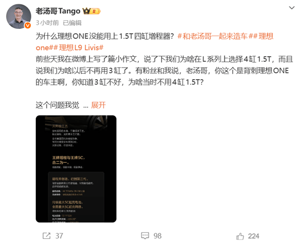 理想汽車產品線負責人“@ 老湯哥”近日通過社交平臺發文,詳細闡述了理想ONE未采用1.5T四缸增程器的技術背景與決策邏輯。他坦言,這一選擇并非主觀意愿,而是受限于當時市場環境與技術條件下的最優解。