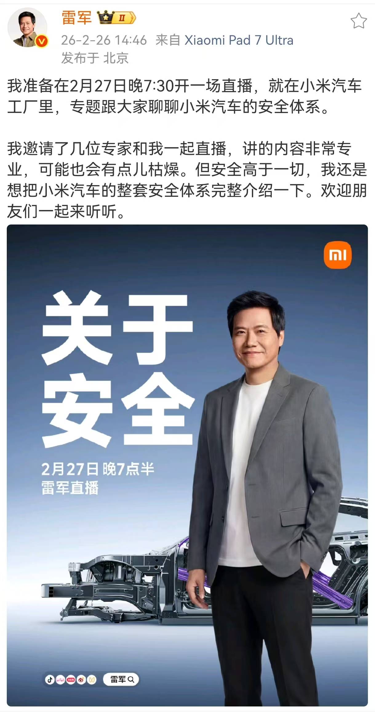 雷軍2月27日晚再開直播,攜專家深度剖析小米汽車安全體系