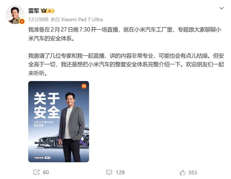 小米科技創始人雷軍近日宣布,將于2月27日晚7點30分通過直播平臺,在小米汽車工廠舉辦一場關于汽車安全體系的專題分享會。此次直播將聚焦小米汽車在安全領域的核心技術突破與系統設計理念,為公眾揭開其安全架構的研發邏輯。