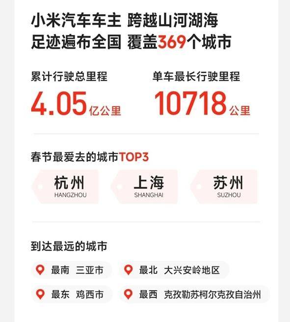 從地理分布來看,車主足跡覆蓋全國369個城市,杭州、上海、蘇州成為最受歡迎的三大目的地。更令人驚嘆的是,小米汽車用戶駕駛車輛從祖國最南端的三亞一路向北,抵達最北端的大興安嶺地區(qū);從最東端的雞西橫跨至最西端的克孜勒蘇柯爾克孜自治州,用實際行動丈量著中國版圖的遼闊。