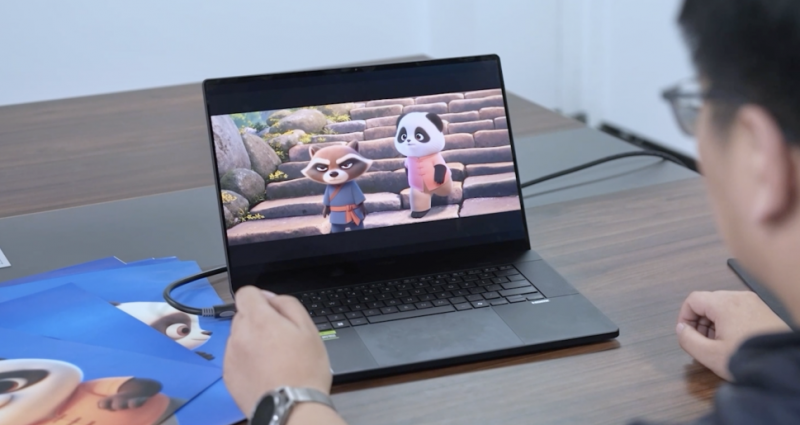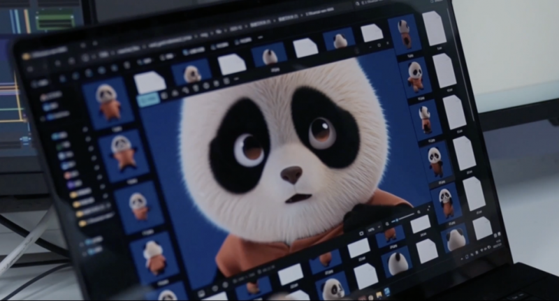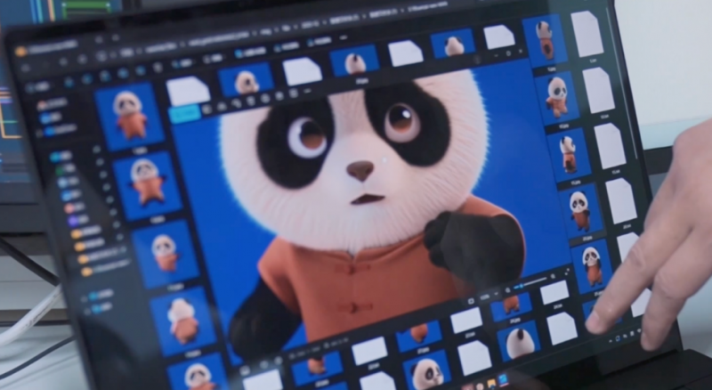 《團圓令》的角色陣容豐富,除了熊貓兄妹,還有小浣熊一火、水獺湯湯、畢婆婆、烏鴉大叔等,故事的場景也十分多元,金木水火土五族各有不同布局,這些在傳統手繪模式下往往需耗時數年,但在華碩ProArt 創16的強大AI 算力支撐下,30秒能生成20套角色方案,4K超高清水墨場景每分鐘12幀自動渲染,連熊貓的毛發都能動態模擬,效率直接提升80%。