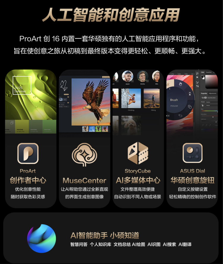 針對AI創作的特殊需求,華碩ProArt 創16帶來了一套專屬智能生態系統。StoryCube一站式AI多媒體中心,可智能分類管理海量素材,極大提升素材檢索效率;ProArt創作者中心就像一個總控制臺,所有AI軟件在這里一鍵開啟,讓創作環境整潔又高效,而且支持自定義設置,讓設備更貼合團隊的創作習慣;小碩知道 AI智能助手則提供智慧問答、文檔總結、AI繪圖等多元化功能,成為創作過程中的得力伙伴。華碩創意旋鈕,深度適配主流創作軟件,通過指尖旋轉即可實現筆刷調節、圖層透明度修改等超70項快捷操作,顯著提升操作精度與效率。
