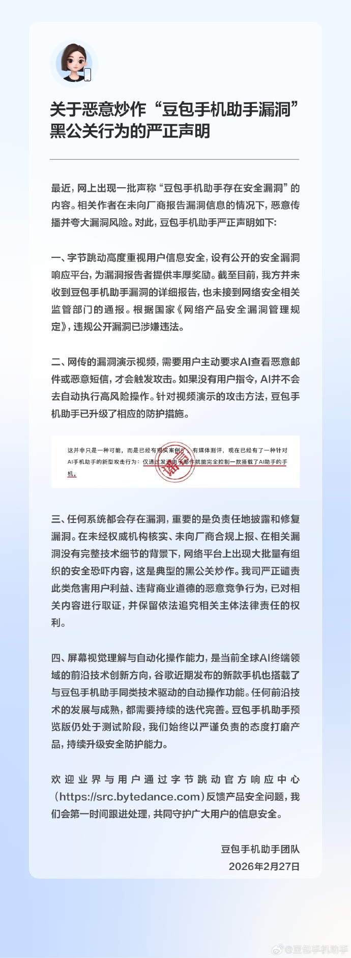 豆包手機(jī)助手回應(yīng)漏洞爭(zhēng)議:未收?qǐng)?bào)告已升級(jí)防護(hù),譴責(zé)黑公關(guān)炒作