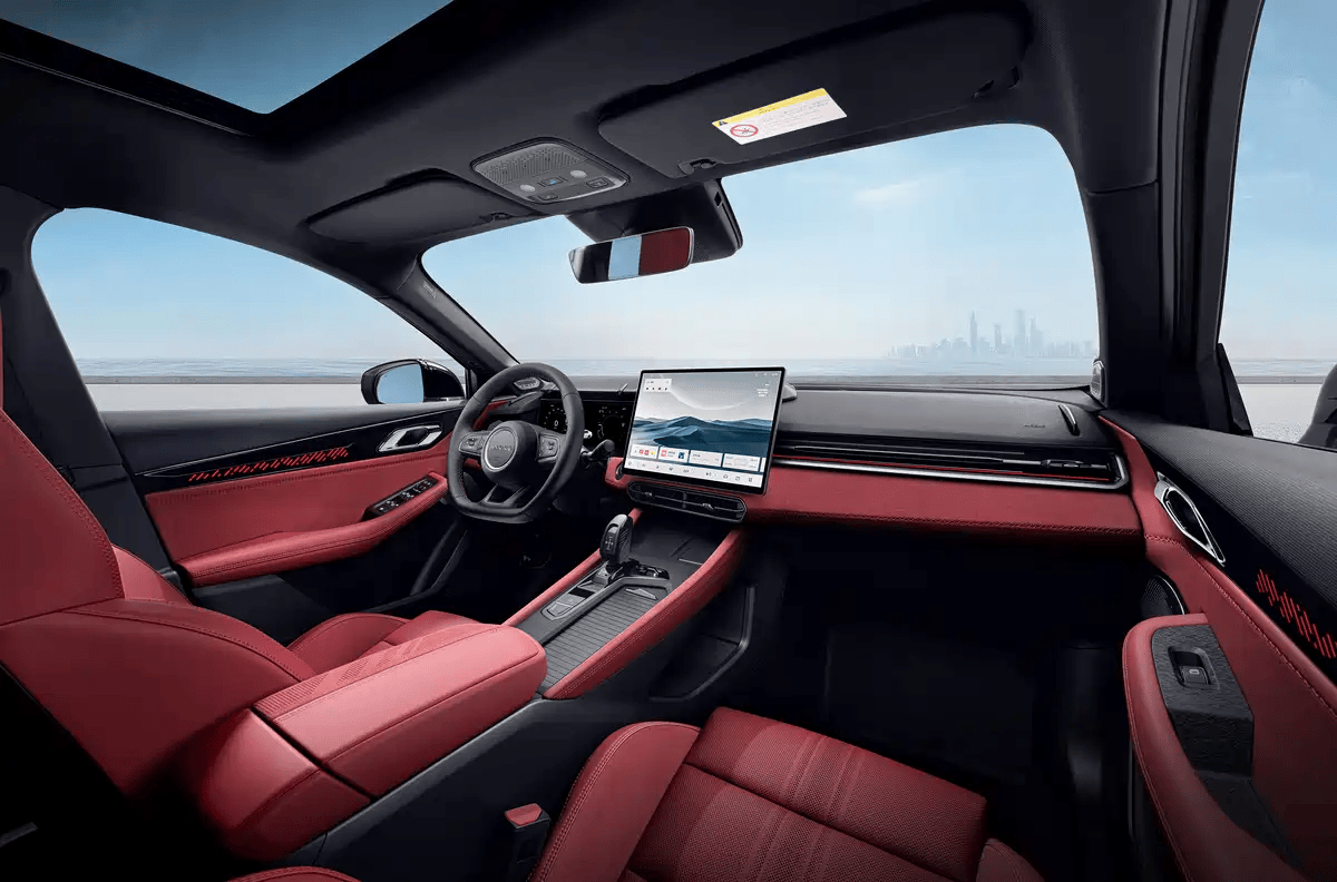 內(nèi)飾設(shè)計(jì)上,新車采用了熾熱紅主題配色,營(yíng)造出極具運(yùn)動(dòng)感的座艙氛圍。官方描述稱,這種紅色如同賽道殘影在車內(nèi)流動(dòng),進(jìn)一步強(qiáng)化了整車的運(yùn)動(dòng)基因。車內(nèi)配置包括三輻式平底運(yùn)動(dòng)方向盤、全液晶儀表盤以及中控多媒體大屏,中控通道區(qū)域還配備了電子換擋桿,整體布局兼具科技感與實(shí)用性。