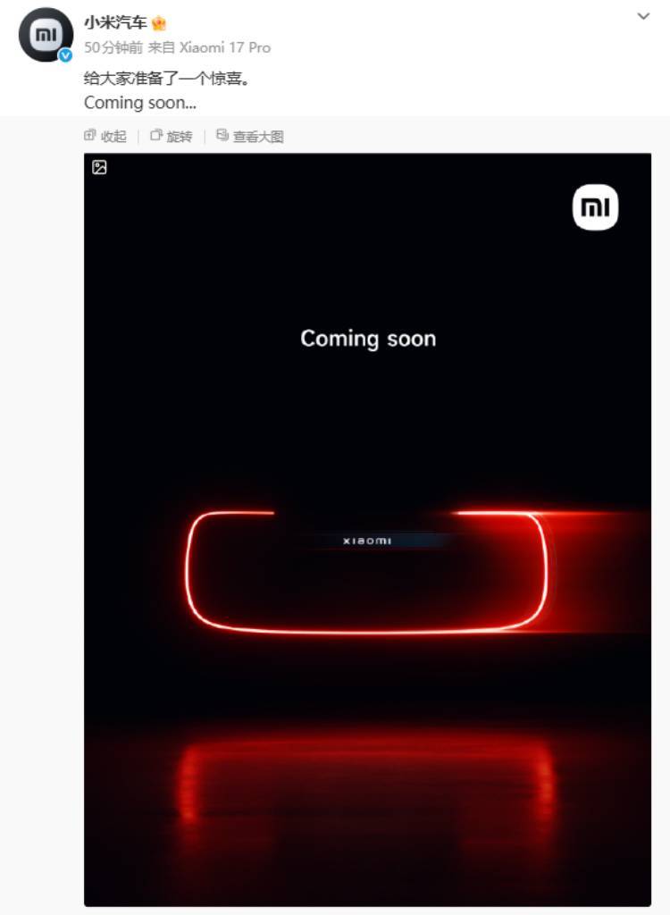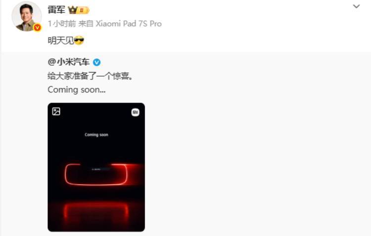 小米汽車近日動(dòng)作頻頻,引發(fā)市場(chǎng)高度關(guān)注。先是小米汽車官方微博發(fā)布神秘預(yù)告:“給大家準(zhǔn)備了一個(gè)驚喜。Coming soon…”,隨后雷軍轉(zhuǎn)發(fā)并簡(jiǎn)短留言“明天見”,這一互動(dòng)迅速點(diǎn)燃了網(wǎng)友的好奇心。