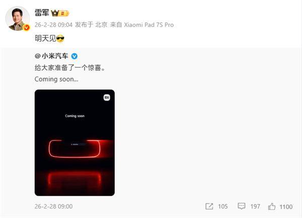 雷軍預告明日揭曉驚喜,小米汽車或攜超級跑車概念車亮相MWC 2026